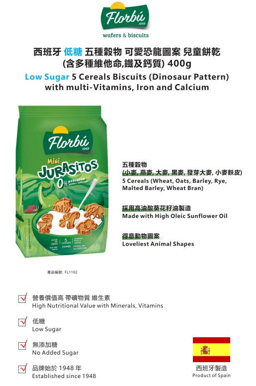 Florbú 西班牙低糖五種穀物可愛恐龍圖案兒童餅乾 (含多種維他命,鐡及鈣質) 400g